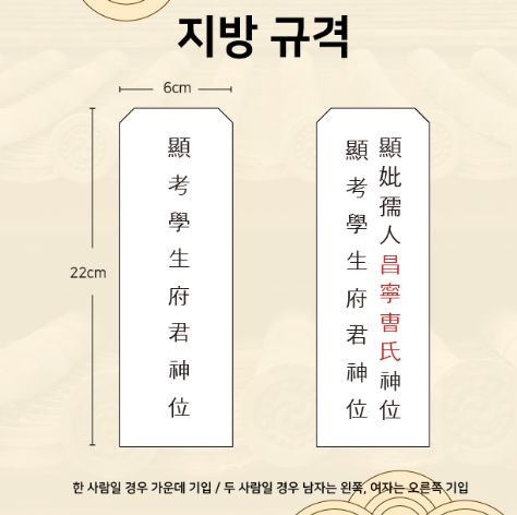지방에는 원래 정해진 규격이 없지만 신주를 약식화한 것이므로 신주의 체제에 유사하게 제작하는 것이 좋을 것이다전통적으로 지방은 깨끗한 한지에 길이는 주척 周尺으로 한자 尺 두치 寸이고 너비 幅가 세치 寸인 바 길이는 22cm 에 너비가 6cm정도이다. 자주 쓴다면야 자연스레 기억하게 되겠지만 그렇지 않으니 꼭 몇글자는 헷갈릴 수 있죠. 한번만 만들어 놓으면 따로 수정할 일은 없습니다.